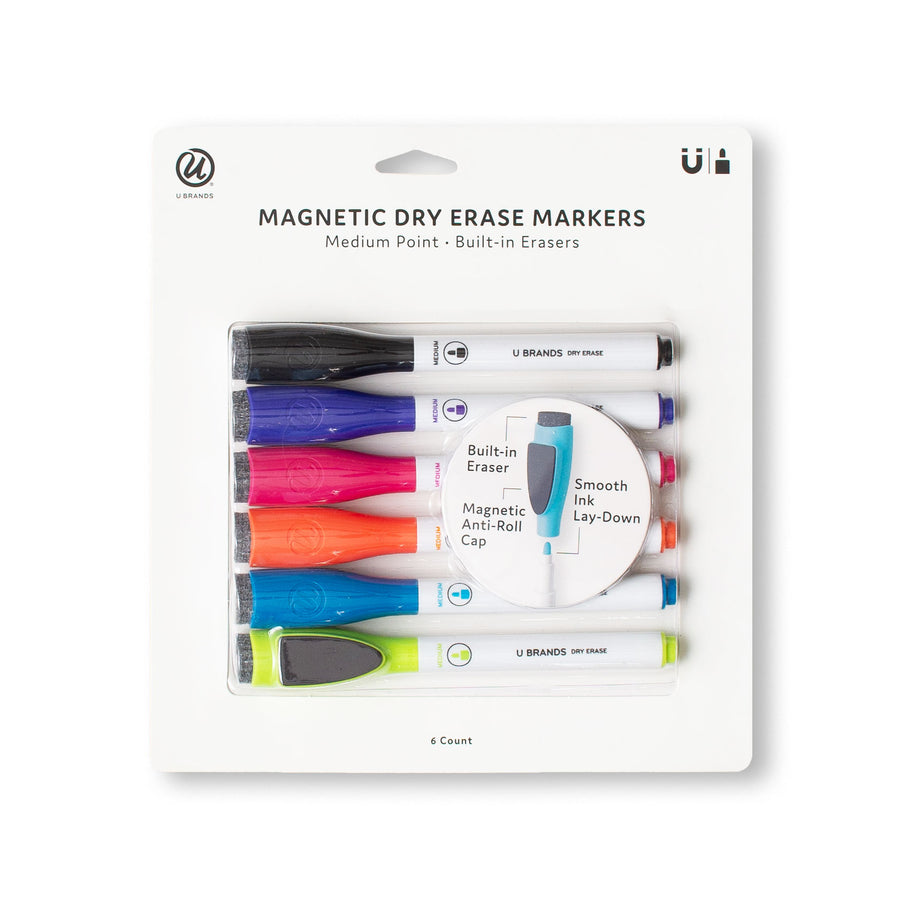 Bring bold color to your writing with these medium dry-erase markers, perfect for classrooms, homes, and offices! This set of six vibrant colors—black, purple, red, orange, blue, and green—features medium tips for smooth, precise writing. Magnetic caps with built-in erasers make them convenient and easy to store.