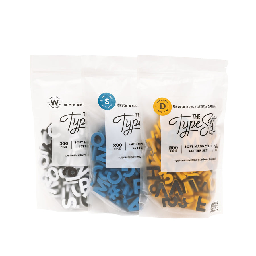 - Sets Include: 200 Letters, Numbers, Symbols, and Punctuation