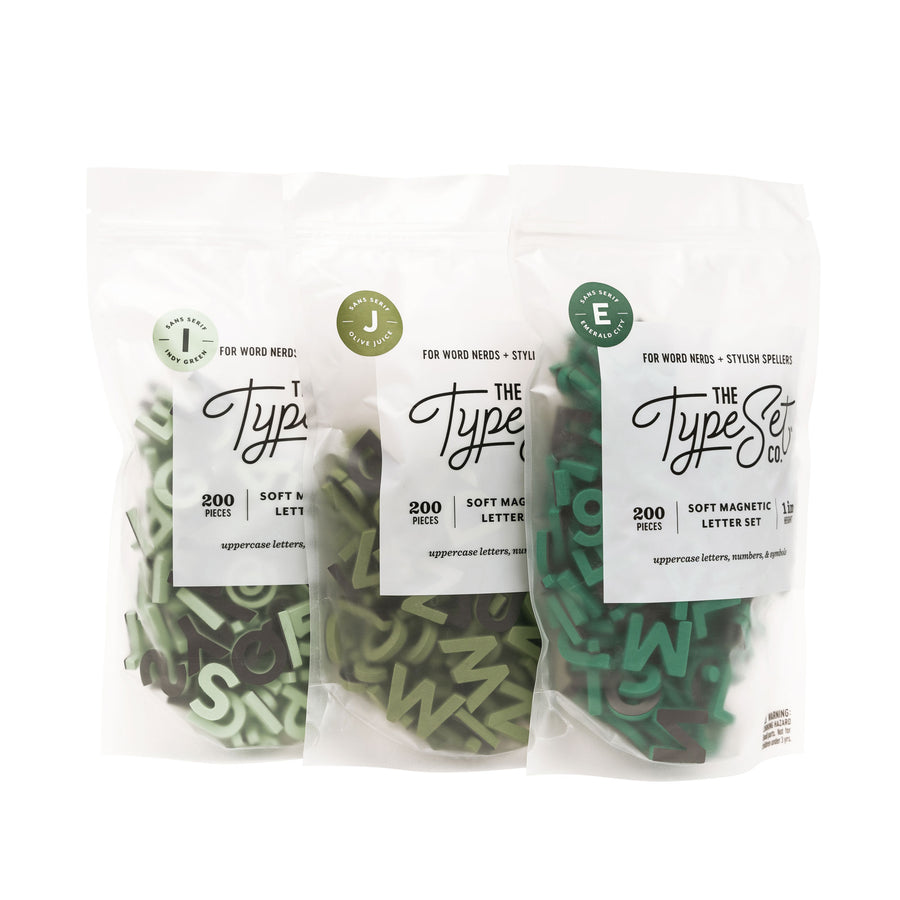 This evergreen bundle will spruce up your home all year long! Includes three sets of magnetic letters in mint, olive, and emerald.