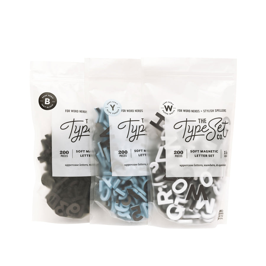 - Sets Include: 200 Letters, Numbers, Symbols, and Punctuation